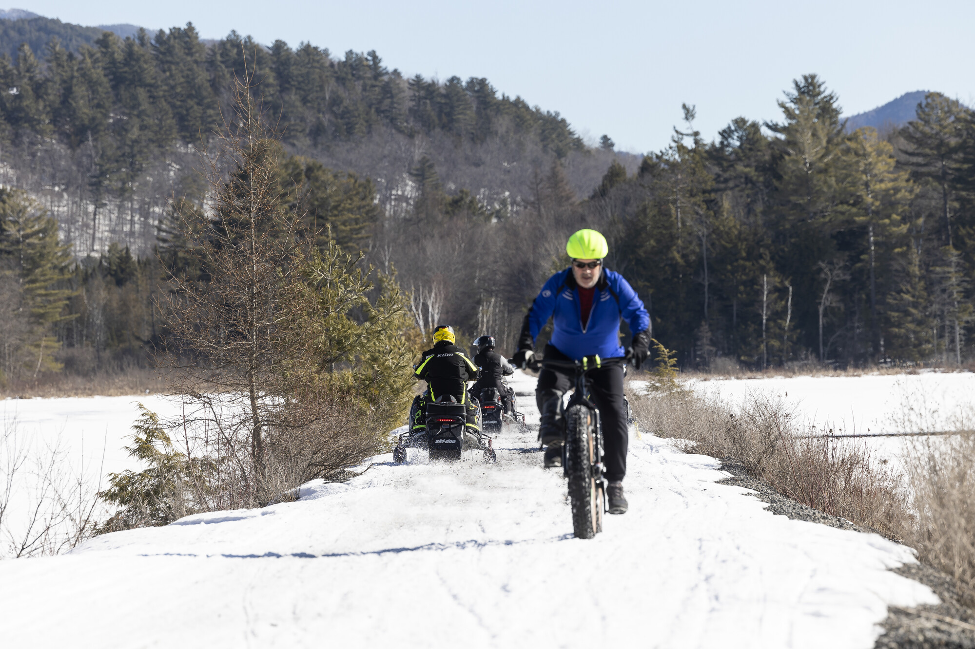 The wide path allows for multiple user-groups to easily recreate together, with plenty of space to pass one-another safely. In spring, summer, and autumn, users are able to hike, run, bike (including road bikes, hybrids, mountain bikes, recumbents, fat bikes and Class 1 e-bikes), and enjoy the unique Adirondack flora and fauna that exists all around the trail. Keep in mind that motorized vehicles, aside from snowmobiles and Class 1 e-bikes, are prohibited on the entire corridor in all seasons.